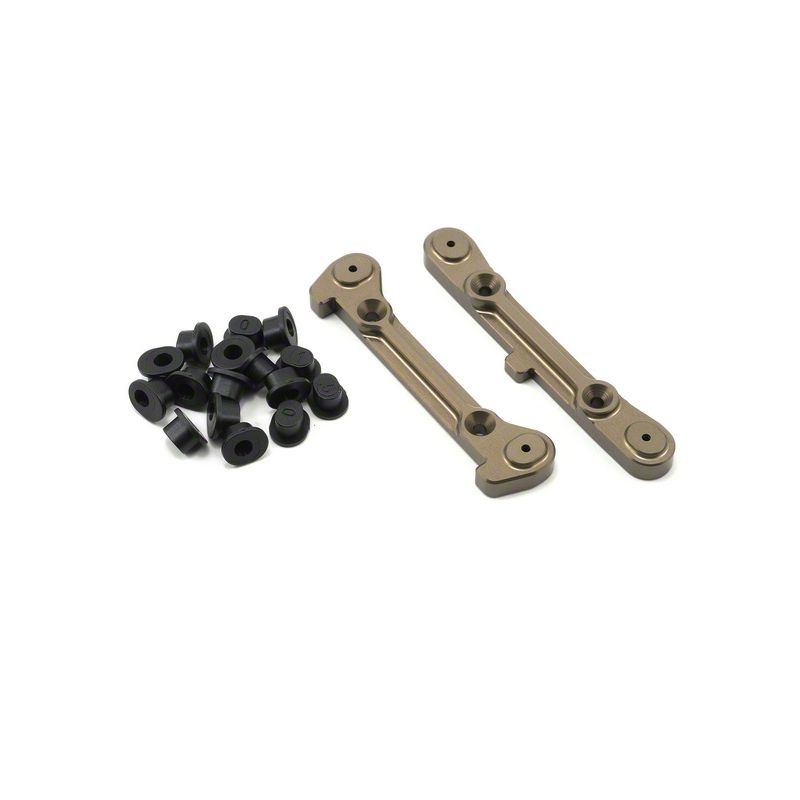 This is the Adjustable Rear Hinge Pin Brace with inserts for the Team Losi 8IGHT buggy and 8IGHT-T Truggy. This hinge brace has been machined from 6mm aircraft grade aluminum, and hard anodized for durability. This plate has been redesigned from the previous version. It is now a solid plate, and eliminates the holes in the brace for greater reliability. This brace set with inserts includes 16 adjustment cams for quick and easy Toe, Anti-Squat, and Kick-Up adjustments.