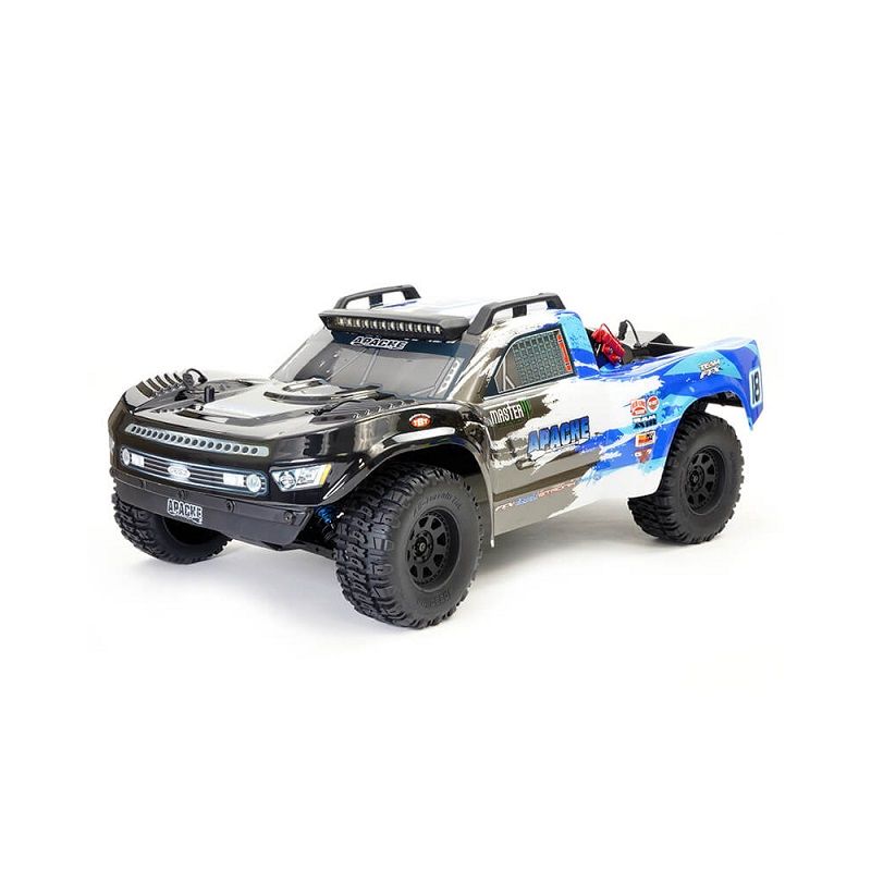 On top, the stylish semi-scale Trophy Truck Apache body features impactful graphics resulting in an eye-catching vehicle in either blue and red, topped off with moulded roof skid rails, roof LED light bar and rub-ber front mud flap.