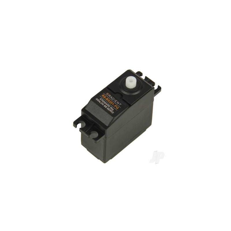 Offering the size, power, torque and speed to suit a variety of applications Radient servos are rapidly building a reputation for reliability that compliments their outstanding value. This dual ball raced, water resistant, 5kg 'standard' unit is no exception.
