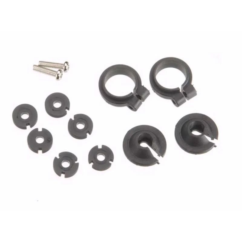 This is a replacement shock piston set from Traxxas. Set includes two upper plastic spring clamps, two 2.5 x 9mm screws, and two each one hole pistons, two hole pistons, and three pistons. Set includes enough parts to rebuild two shocks.